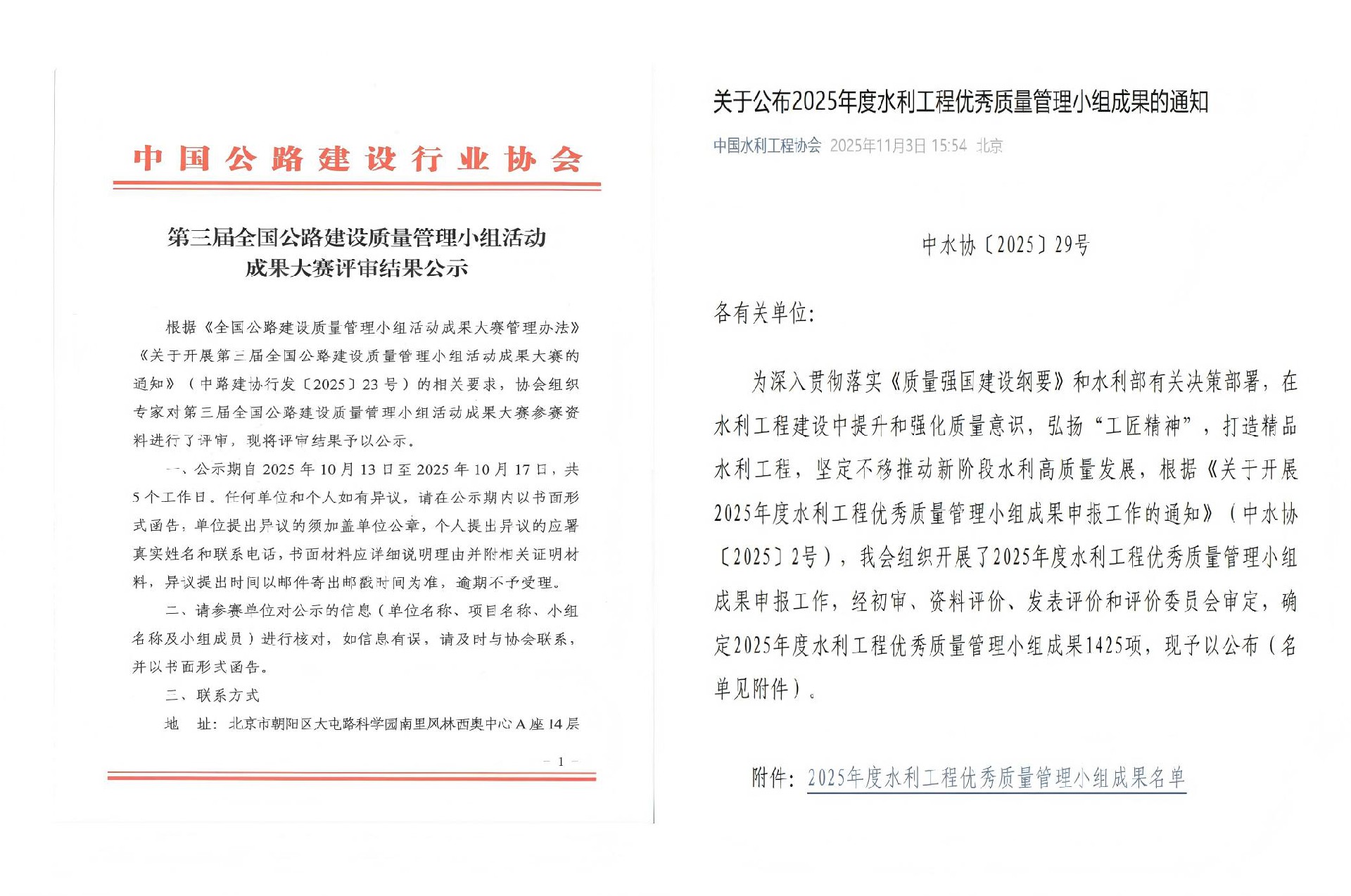 近日,中國公路建設行業(yè)協會、中國水利工程協會先后公布了第三屆全國公路建設質量管理小組活動成果評審結果和2025年度水利企業(yè)質量管理小組競賽活動結果。“···